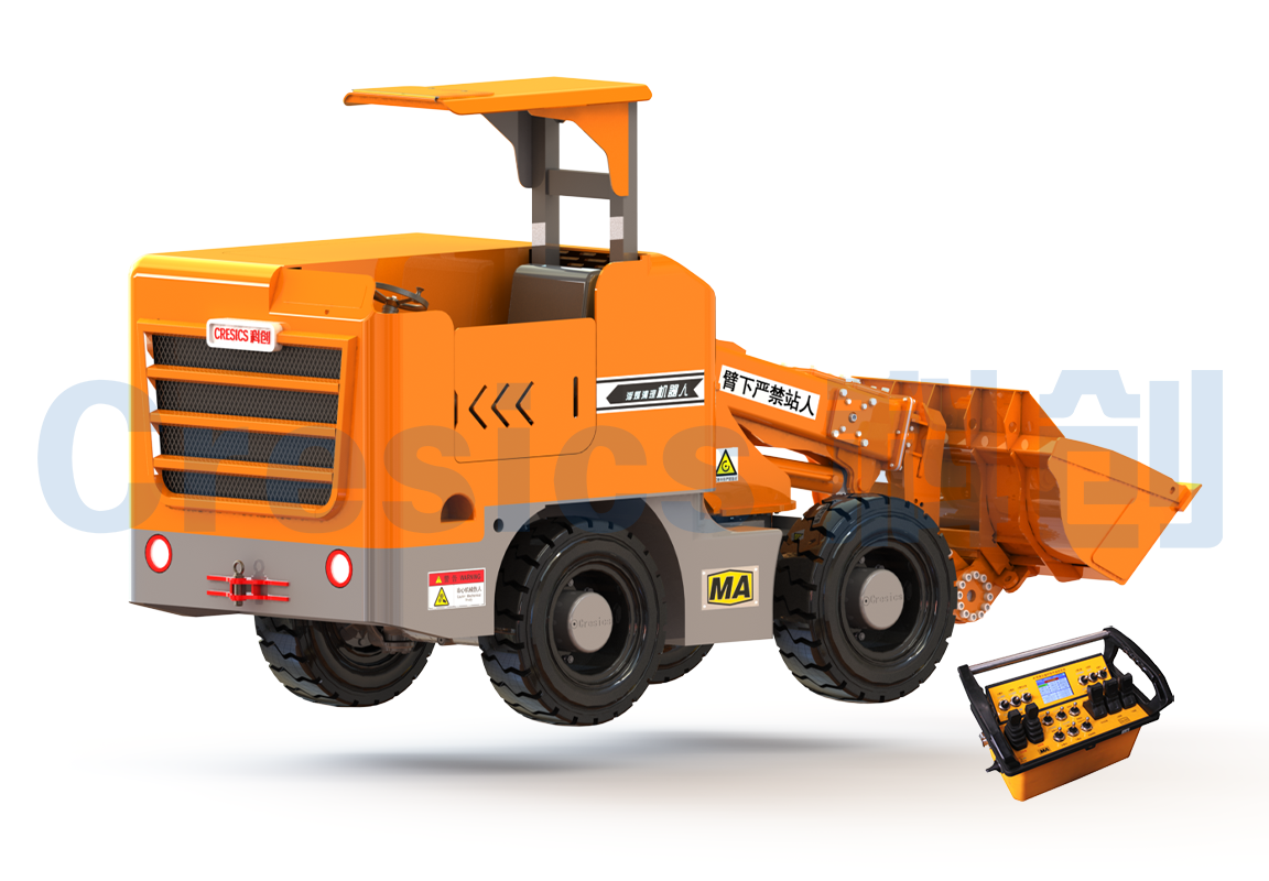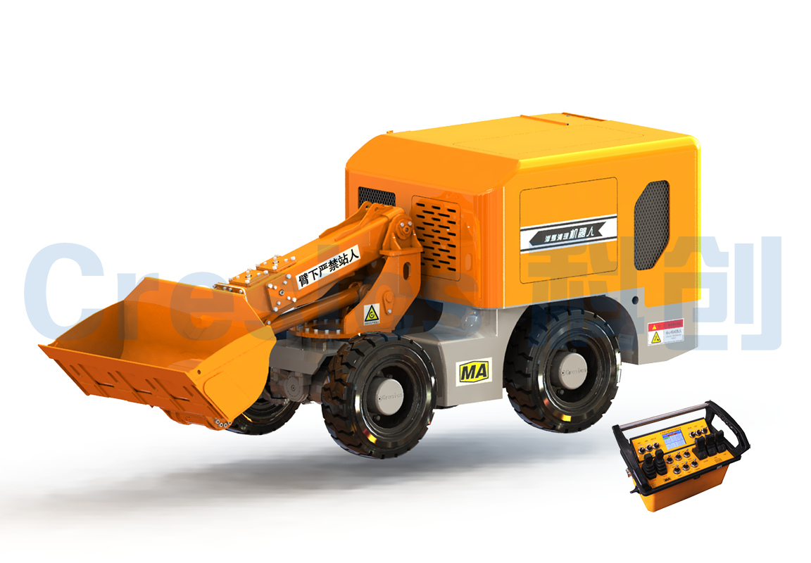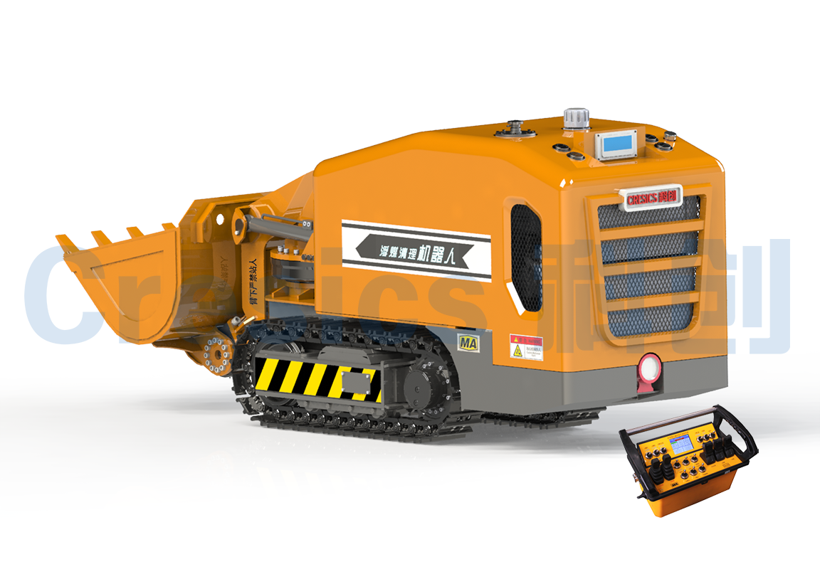 該機(jī)器人主要由行走機(jī)構(gòu)、鏟裝作業(yè)機(jī)構(gòu)、防爆柴油機(jī)動(dòng)力系統(tǒng)、電控系統(tǒng)等部分組成,可實(shí)現(xiàn)無線遙控 操作、鏟裝作業(yè)、動(dòng)臂回轉(zhuǎn)、鏟斗側(cè)卸等功能,能夠較好的清理狹小空間的浮煤。